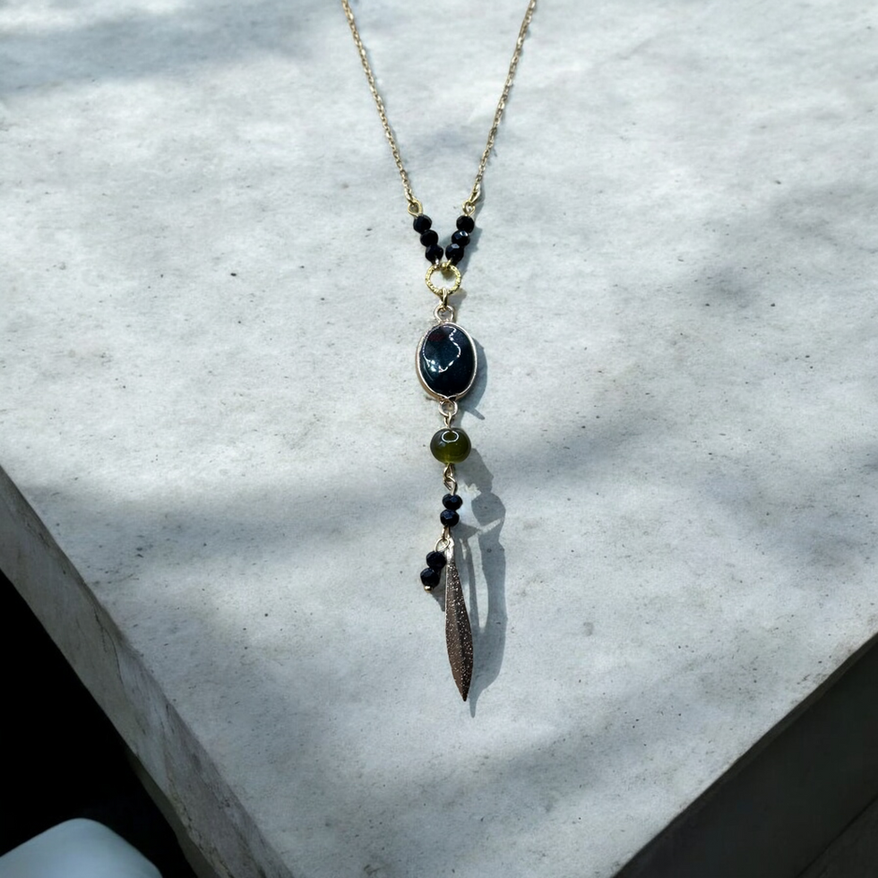 Sautoir long en acier inoxydable doré, avec des perles noires et une feuille dorée.